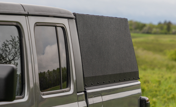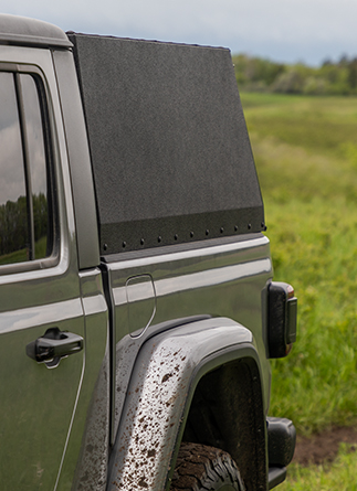 Rear shatterproof plexiglass window panel opens effortlessly with gas springs. The front pass-through opening allows access from the truck cab to the bed while heavy duty gaskets guarantee an airtight seal against cab window.