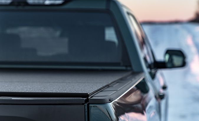 The water-shedding design and waterproof hinges route water away from the bed without gutters or drains. The hard folding tonneau overlaps the bed rails with a continuous seal along the entire length of the side rails, preventing elements from entering the truck bed.