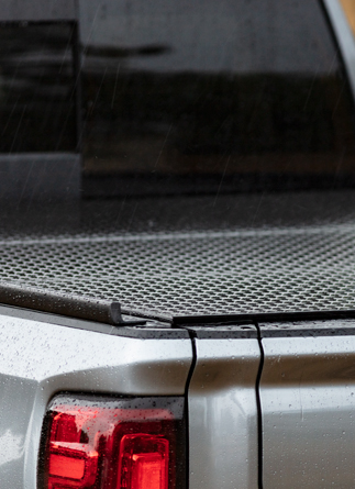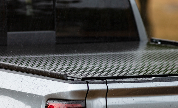 The water shedding design and waterproof hinges direct water away from the pickup box, no gutters or drains needed. The aluminum tri-fold tonneau overlaps the box rails with a continuous seal down the full length of the side rails, preventing elements from entering the pickup box.